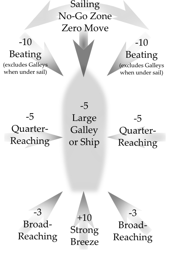 Today's graphic work is a finished version of the sailing modifiers diagram I posted back in October. I've adjusted the alignment of the text and arrows, added the missing modifiers, and added some "fuzz" between the text and the arrows to make the text more readable.On the ready reference charts beside the diagram will be a couple other rules/modifiers necessary for waterborne movement: effects of river currents, effects of gale-force winds on sailing ships, and effects of a Strong Breeze on galleys. Also, river travel halves sailing speeds, while galleys under sail halve bonuses and double penalties.
