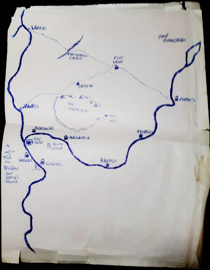 For reference, here is a phone pic of the original map I used about ... five years ago, I think? It's pretty crude and beat up. And really, that was the only handout I used at the time. I did give a quick run-down at the time of a couple bits of information that are in the new handout, but I really didn't take that long to explain the setting. It's a pretty simple setting.