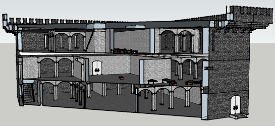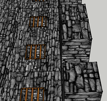 Interior details are still being worked on, but I have arrow slits, machicolations for the battlements, and small grated windows for air flow (shown here next to a staircase.)