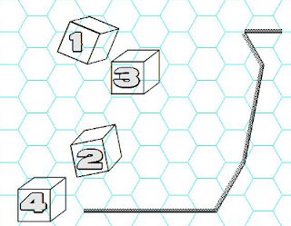 The pic to the left shows 3d10 (actually, they're d20s, but let's pretend) and 5d6. Each d10 is the "center" of a blob, or possibly just its main point. We look at how the d6s cluster around it to get the rough shape and extent of the blob. Each d6 represents one "arm" extending in the indicated direction, while the result of the d6 represents the number of hexes it extends. For example, the d6 marked "5" to the left of the d10 marked "2" indicates that the #2 blob extends 5 hexes east, while the d6 marked "4" extends 4 hexes southwest.